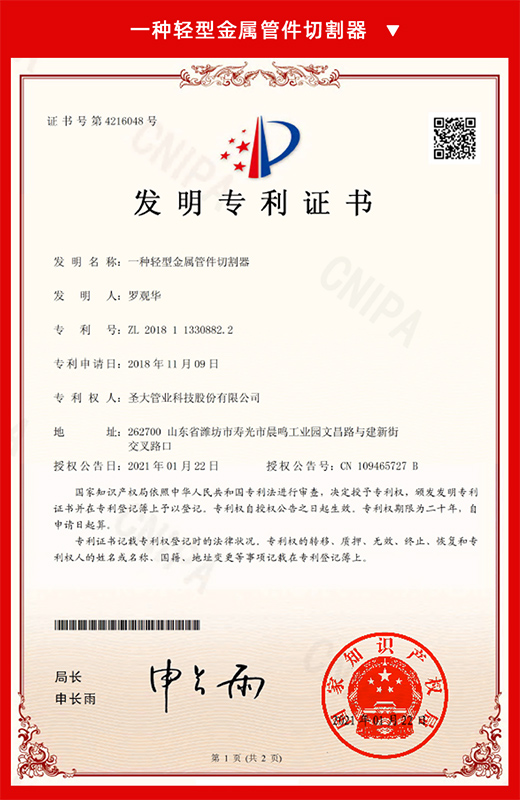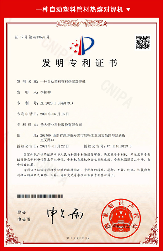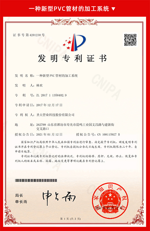 近日,圣大管業(yè)科技股份有限公司申請的3項發(fā)明專利,經(jīng)國家知識產(chǎn)權(quán)局嚴(yán)格審查,正式授予了發(fā)明專利證書。截至目前,公司已擁有各類專利19項。