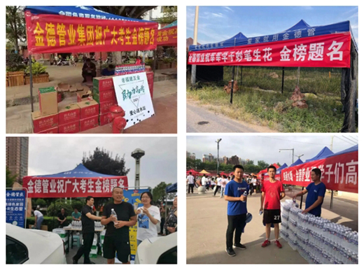 每個(gè)服務(wù)站設(shè)立著“金德管業(yè)”為標(biāo)識的帳篷,供陪考家長在校門外休息。帳篷前有金德家人們?yōu)楦呖伎忌蜕系淖8UZ:“高考必勝”、“金榜題名”……