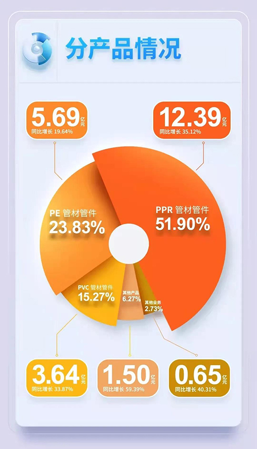 就品類(lèi)而言,塑料管道、不銹鋼管道等依然是核心品類(lèi)。部分上市公司發(fā)布的數(shù)據(jù)顯示,這兩大品類(lèi)的增長(zhǎng)勢(shì)頭不減,以中國(guó)聯(lián)塑為例,2021上半年,其塑料管道系統(tǒng)營(yíng)收約125.74億元,同比增長(zhǎng)24%。偉星上半年的營(yíng)收23.87億元,其中,PPR管材管件占51.9%,PVC管材管件占15.27%,PE管材管件占23.83%,同比增長(zhǎng)幅度在19%到35%左右。