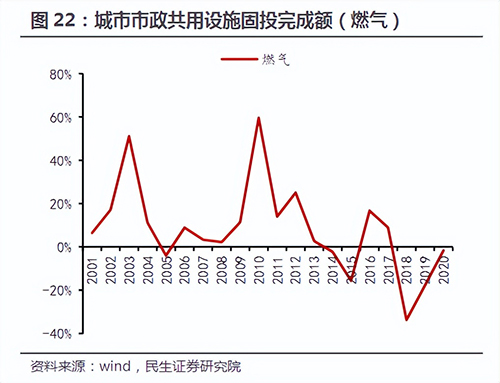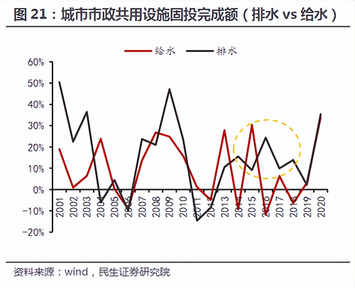 排除2020年疫情干擾,我們選擇2000-2019年的數(shù)據(jù),觀察指標(biāo)是城市市政公用設(shè)施建設(shè)固定資產(chǎn)投資完成額——排水、給水、燃?xì)?,周期性明顯。