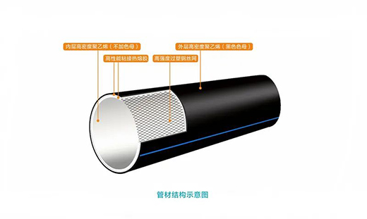 鋼絲網(wǎng)增強(qiáng)聚乙烯復(fù)合管是以高密度聚乙烯(HDPE)管為基管,用包覆有粘接樹脂的高強(qiáng)度鋼絲交叉螺旋纏繞成型的鋼絲網(wǎng)骨架為增強(qiáng)體,選用高性能粘接熱熔膠,將鋼絲網(wǎng)增強(qiáng)體與HDPE管內(nèi)外層緊密粘接,形成三位一體的新型增強(qiáng)復(fù)合管材。