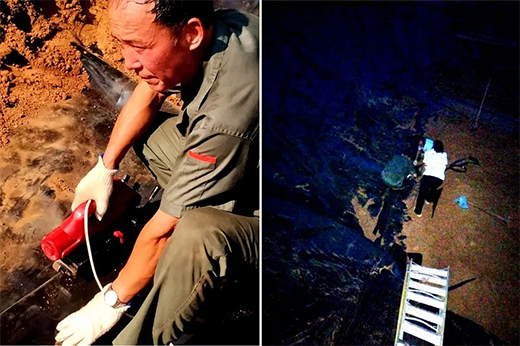 這是魚(yú)塘的焊接施工現(xiàn)場(chǎng),魚(yú)塘高度3米多,四周?chē)?,沒(méi)有一絲的微風(fēng)能夠吹進(jìn)來(lái);被太陽(yáng)直射的膜面溫度可以達(dá)到60℃,觸之燙手。由于高溫是不能施工的,所以為了補(bǔ)足中午的休息時(shí)間,為了完成一天的固定工作量,防滲焊接一般都會(huì)工作到晚上8點(diǎn)。