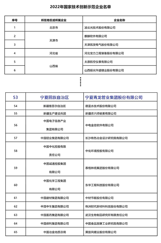工信部辦公廳近日發(fā)布2022年國家技術創(chuàng)新示范企業(yè)名單,寧夏青龍管業(yè)集團股份有限公司成功獲評國家技術創(chuàng)新示范企業(yè),是本年度寧夏回族自治區(qū)唯一上榜企業(yè)。