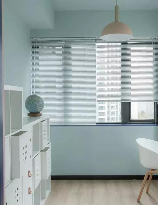 玄關(guān)用上平涂閃藍搭配嵌入式白色的換鞋柜和白色拉式窗簾,讓人們感覺舒服又耐看。