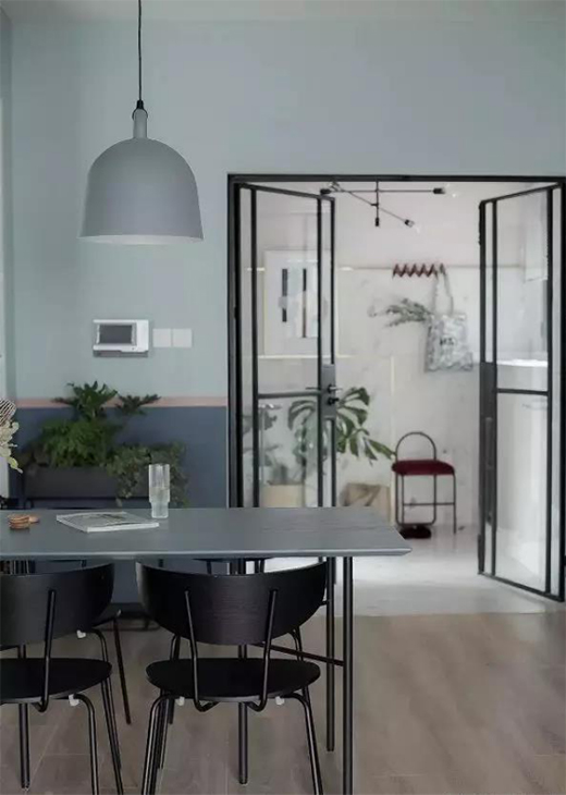 餐廳的墻面上平涂青出于藍色、閃藍色,旁邊放一些綠色的植物顯得和諧又溫暖,再搭配簡約的吊燈,顯得不累贅而又時尚。