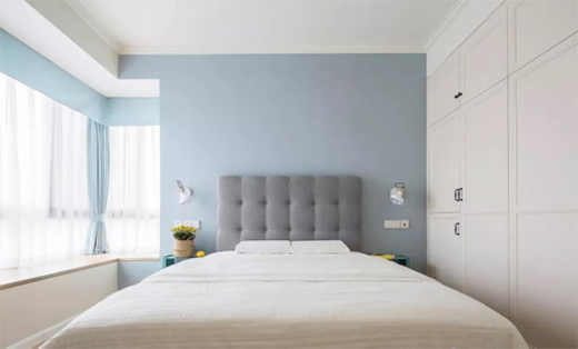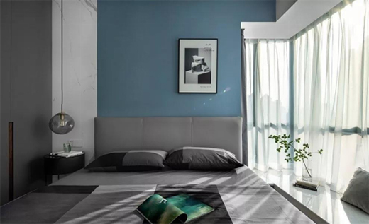 次臥床頭背景墻上海藍加閃藍調(diào)色搭配可以安撫身心疲憊,搭配淺藍色和中性灰色床品,色彩兼容,整體清新自然。