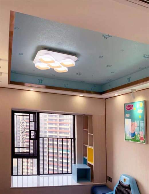 兒童房,用彈涂澗石藍做天花凹凸感加卡通圖案布藝給人可愛溫馨的感覺,簡潔的布局營造一派熱鬧的田園美景中弱化了繁雜的感覺,沿海一帶濕氣重,用上貝殼粉涂料可以達到防霉防潮的效果,減少小朋友因氣候多變所引發(fā)的感冒、發(fā)燒、過敏等問題。
