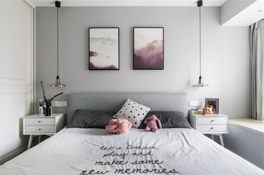 私密空間的處理,尤其彰顯簡約風(fēng)格的內(nèi)涵。臥室背景墻使用純色貝殼粉涂料,以簡約的形式展示,同時也能盡享產(chǎn)品營造出的健康生活空間,讓臥室多了幾分輕松愜意的氛圍。