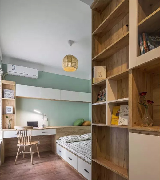 次臥仍然采用淡綠色進行裝飾床頭背景墻,
