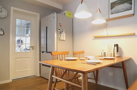 原木色也是北歐風(fēng)的必備,餐廳用白色貝殼粉墻面搭配簡(jiǎn)潔線條原木色餐桌椅,使整個(gè)空間干凈利落。