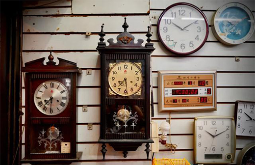 鐘表店的墻壁上掛著幾個老式掛鐘,掛鐘上面是表盤,下面是鐘擺。每逢零點,掛鐘便會發(fā)出“當(dāng)當(dāng)當(dāng)”的報時聲,把人拉入一段數(shù)十年前的舊時光。