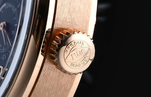 位于腕表右側(cè)的表冠上刻有IWC萬國表的品牌logo,辨識度極高,表冠側(cè)面還做了凹凸不平的處理,方便調(diào)校。