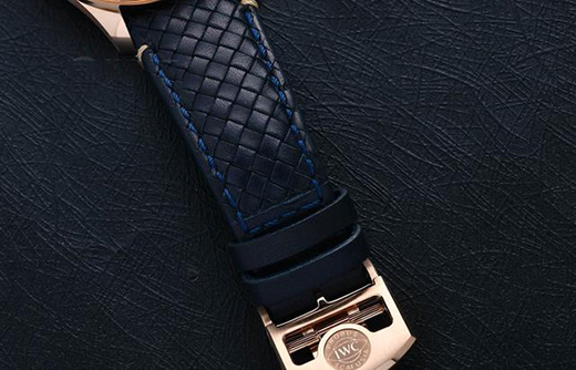 這枚腕表配備的是鱷魚皮表帶,表帶上飾以格紋。與表帶相連接的表扣上同樣刻有IWC萬國表的標志。