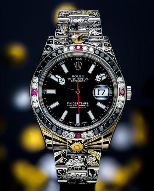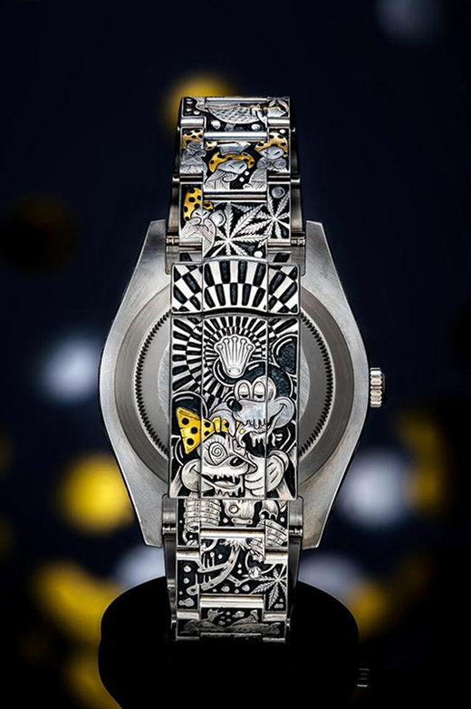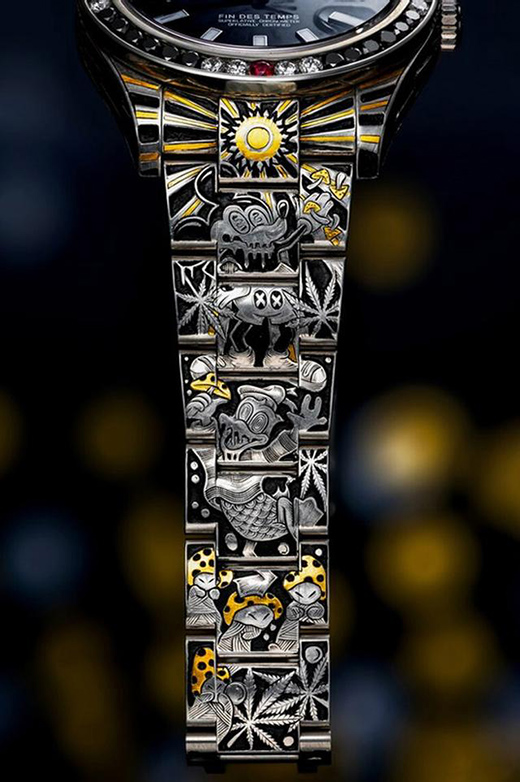 由上圖看到的Fin Des Temps改裝作品為例,它的基礎(chǔ)是勞力士的Datejust,原本手表是一款中規(guī)中矩的三針日期表,但是Fin Des Temps先前為了慶祝米老鼠90歲生日,而特地打造結(jié)合《Runaway Brain》里的瘋狂米奇圖案,這款改裝Datejust從表殼開始就刻上包括米老鼠在內(nèi)的卡通人物,該品牌的金雕透過黑色與金色的映襯,讓手表的金雕圖案更為生動(dòng)顯眼。