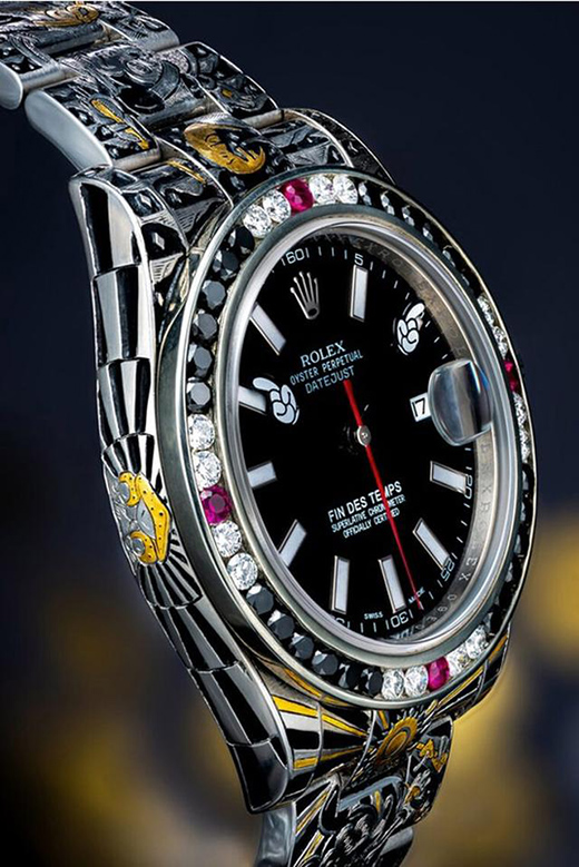 Fin Des Temps成立時(shí)間不算長,2014年才正式發(fā)跡,這個(gè)品牌的改表路線簡(jiǎn)單來說就是金雕,有時(shí)還會(huì)于作品上融入寶石鑲嵌工藝,因此Fin Des Temps創(chuàng)作的改裝表遠(yuǎn)看都好像手表身上多了刺青一樣,品牌偏好修改搭配金屬鏈帶的手表,在表殼以及鏈帶上大顯他們的金工雕刻能力,這個(gè)品牌主力改裝的瑞士表品牌有二,其一為勞力士,再來則是AP,當(dāng)然偶爾也會(huì)看到他們改裝卡地亞或一些古董懷表,但整體而言勞力士和AP手表的改裝比例還是最高。