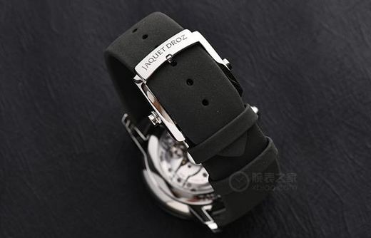 這款腕表的另一個(gè)亮點(diǎn)就是它的卷邊手工小牛皮表帶,天鵝絨質(zhì)感的表帶更加貼合肌膚,提高佩戴舒適度,在一定程度上還能夠減少表帶被污染程度,表扣上刻有“Jaquet Droz ”字樣,別具匠心。