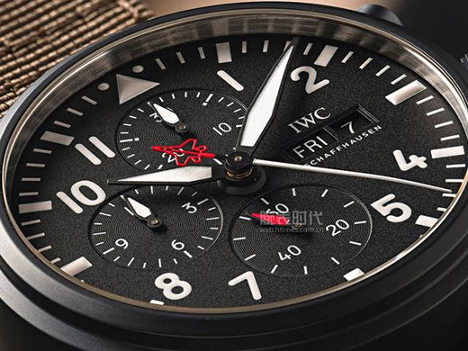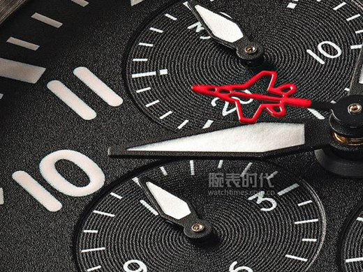 和以往大多數(shù)萬國飛行員系列TOP GUN海軍空戰(zhàn)部隊特別版腕表類似,新款計時腕表“SFTI”特別版整體采用黑色,點綴以紅色,時標、刻度和指針均采用對比強烈的白色,以求達到最大的易讀性。和2018年僅面向Top Gun畢業(yè)生發(fā)售的萬國“攻擊戰(zhàn)斗機戰(zhàn)術教練”特別版不同,新款腕表9點位沒有了標志性的TOPGUN畢業(yè)生刺繡章,而改為12小時計時器子表盤。6點位小秒盤,12點位為30分鐘計時器子表盤。3點位設有星期日歷窗口。計時秒針呈現(xiàn)海軍噴氣戰(zhàn)機造型,針尾與6點鐘位置的小秒針均點綴紅色裝飾。