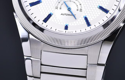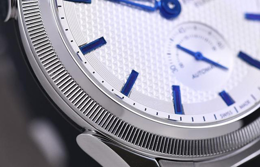 表盤6點(diǎn)位置處則設(shè)立了精巧的小秒盤,小秒盤上設(shè)有獨(dú)特的雙面指針,短邊指示0-30秒,長邊指示30-60秒,設(shè)計(jì)巧妙。盤面12點(diǎn)位置下則設(shè)立了清晰明了的大日歷顯示視窗,便于佩戴者快速讀取盤面信息。
