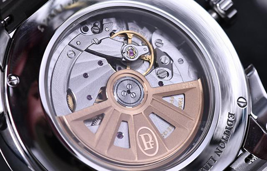腕表內(nèi)部搭載了PF044機(jī)芯,機(jī)芯所見之處均經(jīng)過精美的手工裝飾,還配有22K金質(zhì)擺陀,振頻28,800次/小時(shí)(4赫茲),還配有22K金質(zhì)擺陀,上滿弦后可提供45小時(shí)動(dòng)力儲存,防水深度可達(dá)100米。