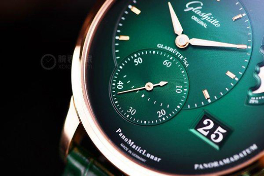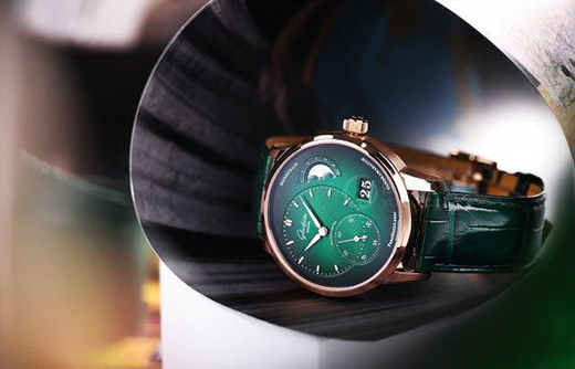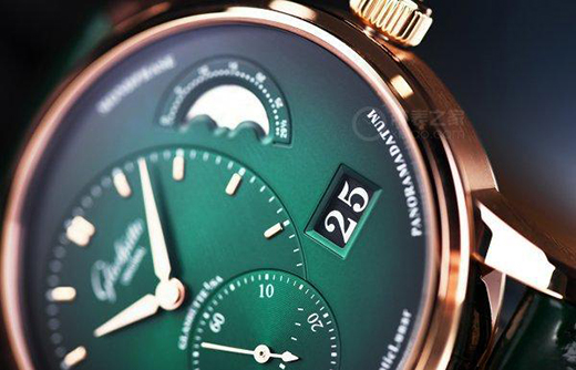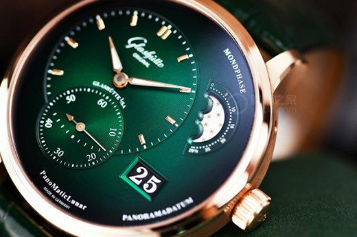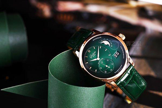 綠色,是生機、是期望,它總是能讓我們想到美好的事物。在制表上,這幾年綠表非常流行,綠色讓腕表呈現(xiàn)出了與眾不同的氣質(zhì)。這次我們拿到了格拉蘇蒂原創(chuàng)全新的偏心月相腕表紅金款,其實之前格拉蘇蒂原創(chuàng)就已經(jīng)推出過了兩款不同表帶的精鋼款。作為中國首發(fā),今年的這一款以紅金材質(zhì)搭配森林綠色表盤,色彩更加鮮明濃烈。