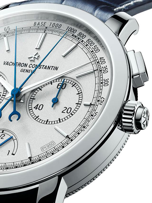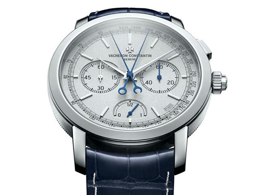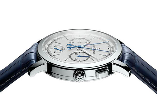 Traditionnelle超薄雙秒追針計時碼表的面盤格局大致維持與前作相仿,例如面盤外緣有測速計刻度、3點方向為計分盤、9點方向為小秒盤,至于6點方向則是手表48小時動能的顯示盤,其中走時功能指針為白金材質(zhì),而與計時功能相關(guān)的指針則改以藍鋼處理(動力儲存顯示指針算是例外),不同功能的指針看起來一目了然。