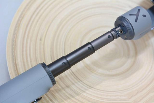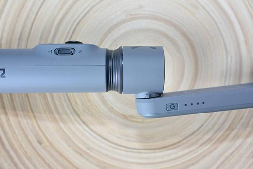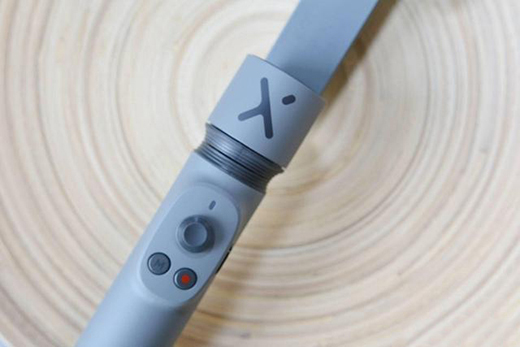 Smooth-X的手柄是最核心的操控部分,正面設(shè)計(jì)很簡(jiǎn)潔,中間有圓盤(pán)是控制軸向,左右控制航向軸,上下控制橫滾軸;M按鈕是模式切換,雙擊可實(shí)現(xiàn)手機(jī)橫拍或豎拍;紅點(diǎn)按鈕就是拍攝/錄制;以及右側(cè)還有一個(gè)變焦撥鈕。另外,和自拍桿一樣是可以伸縮的,這會(huì)增加延長(zhǎng)至260mm。每一節(jié)連接處都有固定螺絲,做工比較扎實(shí)。
