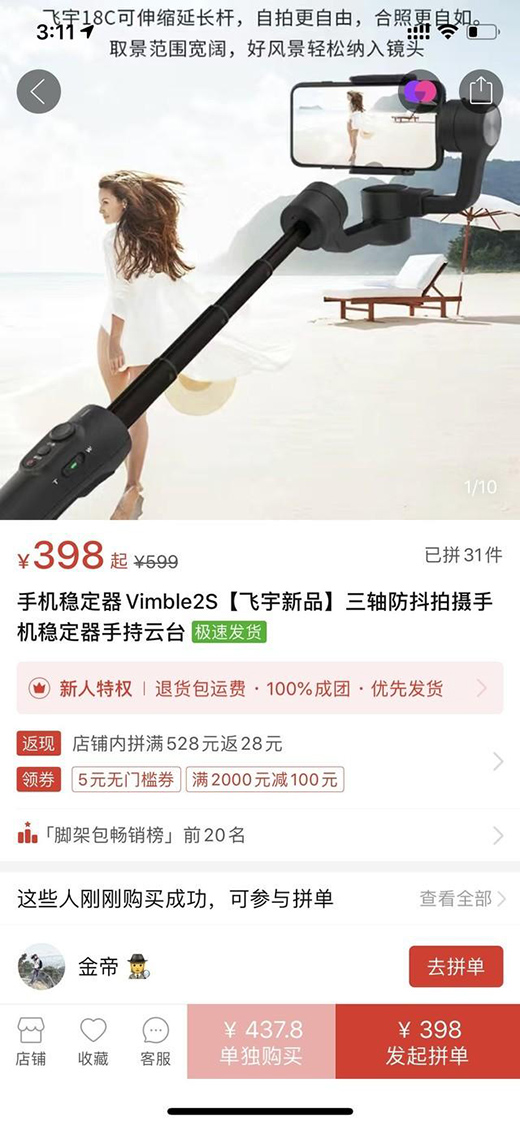 但是由于這款穩(wěn)定器確實(shí)種草,自拍桿+穩(wěn)定器的結(jié)合,這不就是我夢(mèng)想中的穩(wěn)定器嗎?秉著不死心的心態(tài),筆者決定貨比三家,打開的平臺(tái)越多心越?jīng)?,一水?99元讓給我一種我的錢包正在想我揮手告別的感覺。直到筆者打開拼多多,看到飛宇Vimble 2S售價(jià)僅398元了,突然感覺錢包有救了——啥也不說了直接買它!