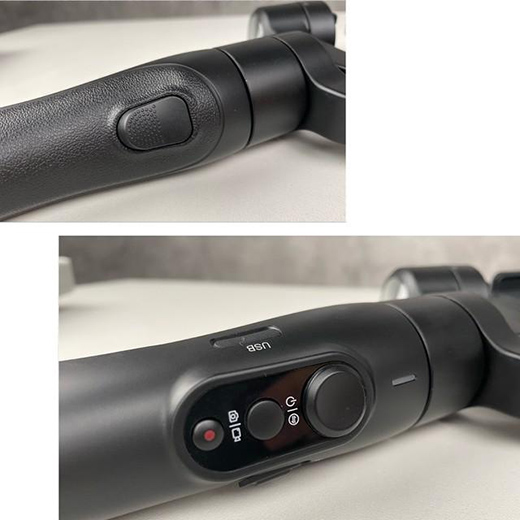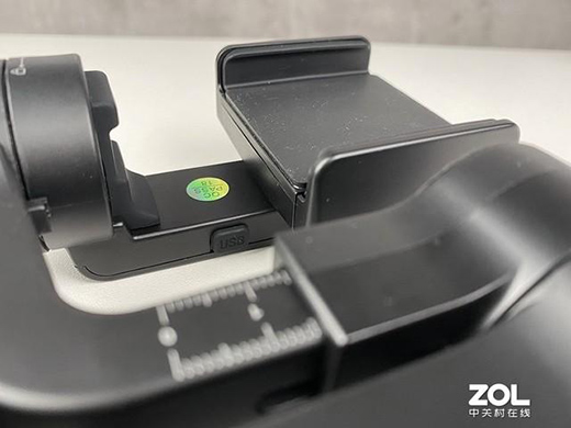 在手柄側(cè)邊有著Micro-B的電源接口,另一邊是推動(dòng)變焦控制開關(guān),藍(lán)牙連接手機(jī)后,可以通過這個(gè)變焦開關(guān)控制手機(jī)鏡頭的焦距。