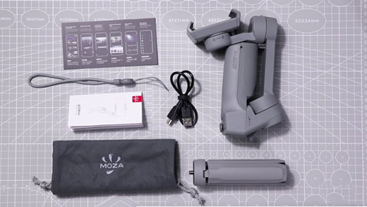首先我們來開個箱,看看里面有什么。這是穩(wěn)定器主機,充電線,掛繩,三腳架和便攜收納袋。
