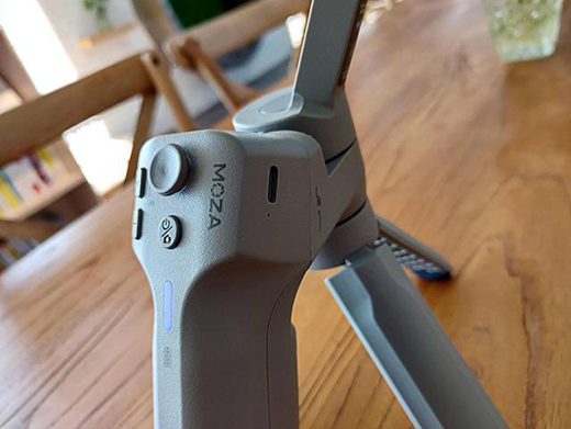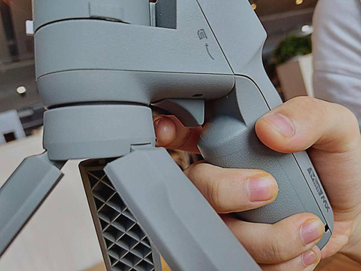 為了方便平衡調(diào)節(jié),需要將標(biāo)配的三腳架安裝在航向軸電機(jī)下方,這個(gè)設(shè)計(jì)有別于一般穩(wěn)定器安裝在手柄底部的1/4螺口。實(shí)際體驗(yàn)發(fā)現(xiàn)這樣的設(shè)計(jì),手握持舒適感會(huì)有明顯的提升,便于單手操控的方便性。