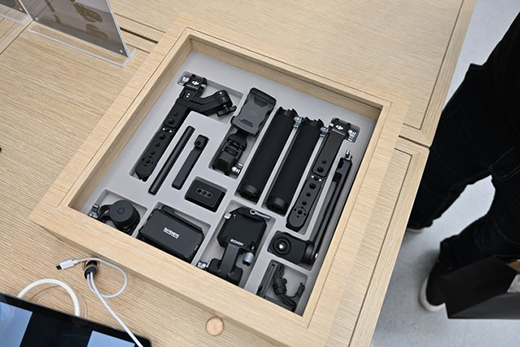 在體驗店內,有很多設計巧思的區(qū)域,比如機甲大師和無人機體驗區(qū),用戶可以自己操作機甲大師進行對戰(zhàn),無人機也可以在體驗區(qū)內飛行,并可以由機械臂更換電池。店內還有穩(wěn)定器和無人機穩(wěn)定性的展示區(qū),非常有意思。Osmo Action展示區(qū)有防水展示,直接將產品泡在水中。還有一個大疆無人機零件的展板,充分說明大疆無人機和配件的精細做工與質量表現。當然每一款產品的配套配件也都有展示,用戶購買前可以進行相關詢問。