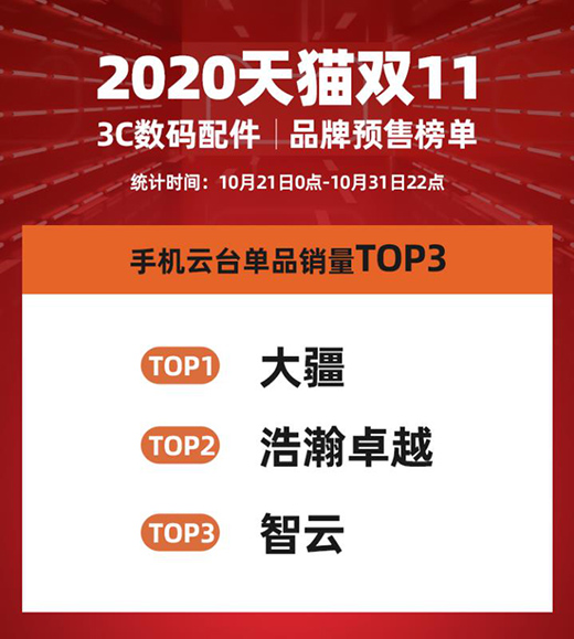 從10月31日開始,數(shù)億“尾款人”涌入淘寶瘋狂下單,截止到當(dāng)日22:00,手機穩(wěn)定器品牌的TOP榜單也正式發(fā)出,浩瀚卓越穩(wěn)定器無疑是今年的黑馬明星,上有大疆,下有智云。