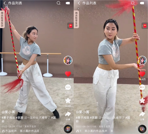 只有降低門(mén)檻,觀眾才能更容易了解這項(xiàng)藝術(shù)?!跋任P(guān)注,再傳播文化?!惫≥奸_(kāi)始從京劇文化的小點(diǎn)出發(fā),與當(dāng)下流行元素相結(jié)合,以小見(jiàn)大,淺入深出。變裝視頻、“京劇彩妝”步驟、造型過(guò)程……“每當(dāng)有數(shù)據(jù)較好的作品,我們就當(dāng)做成功模版保留,再拓展下一個(gè)?!彼幸粋€(gè)短視頻工作室,攝影、剪輯、助理……無(wú)一例外在之前沒(méi)接觸過(guò)京劇,但他們卻成了果小菁作品的場(chǎng)外指導(dǎo)。有一次,她計(jì)劃拍一段耍花槍的視頻,工作室小伙伴想看“花槍從手中扔出再接住”的招式,果小菁就根據(jù)建議進(jìn)行編排。在這些“非專(zhuān)業(yè)人士”幫助下,視頻果然收獲了不錯(cuò)的效果。