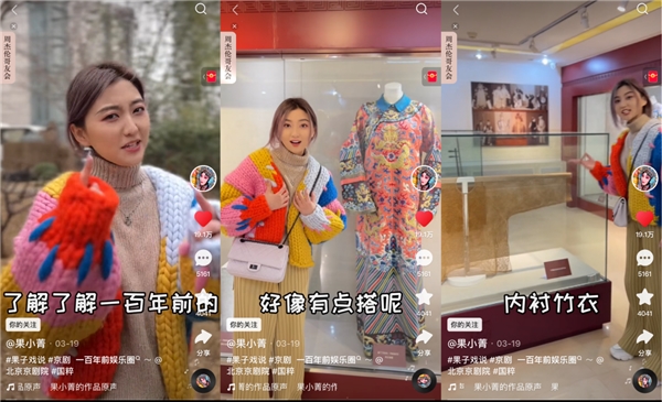 快手平臺(tái)對(duì)傳統(tǒng)文化大力度的扶持也讓果小菁甚感欣慰。“我的一條作品被單獨(dú)做成熱點(diǎn),推上了榜單。”在這條視頻中,果小菁通過(guò)鏡頭引領(lǐng)觀眾們走進(jìn)“北京京劇院”,見(jiàn)識(shí)“100年前的娛樂(lè)圈”。梅蘭芳先生演《四郎探母》時(shí)的“旗蟒”、早期京劇演員表演時(shí)穿的“內(nèi)襯竹衣”......陳列在堂內(nèi)的老物件彰顯了百年前京戲的盛況,也收獲老鐵們近20萬(wàn)點(diǎn)贊。