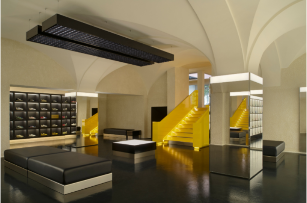 門店內(nèi)部以品牌標(biāo)志性黃色為主色調(diào),明亮的色彩與這座始建于 1856 年的私人住宅——巴黎旅行者大樓(The Travellers Paris)的優(yōu)雅歷史韻味相得益彰。設(shè)計(jì)中融入了清水混凝土、打光的墻面和鮮艷的黃色玻璃等元素,造就了極具吸引力的建筑景觀??臻g的中心是以明亮的黃色玻璃圍裹的陳列柜,展現(xiàn)的是品牌的最新系列產(chǎn)品,為顧客帶來(lái)身臨其境的體驗(yàn)。