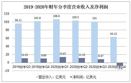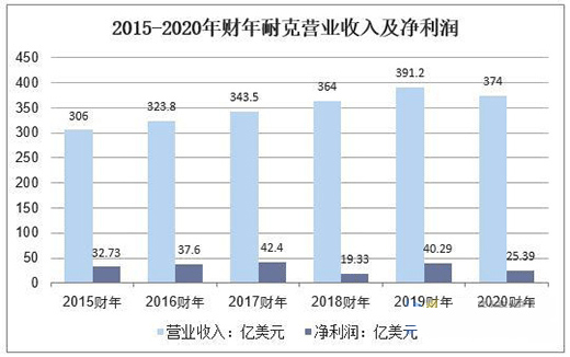 2020年財年,耐克營業(yè)收入和凈利潤分別為374億美元和25.39億美元。