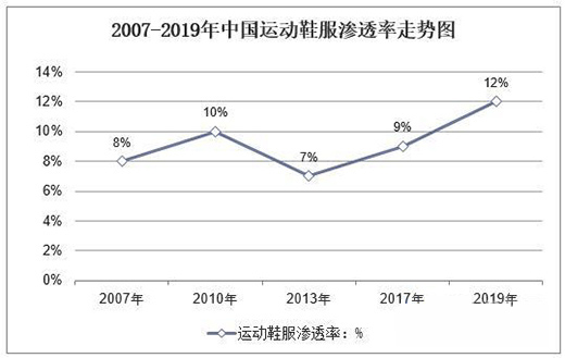 目前國內(nèi)運(yùn)動鞋服的滲透率(運(yùn)動鞋服市場規(guī)模/整體鞋服市場規(guī)模)持續(xù)提升,2019年達(dá)12%,但對比全球其他市場,滲透率仍有提升空間。