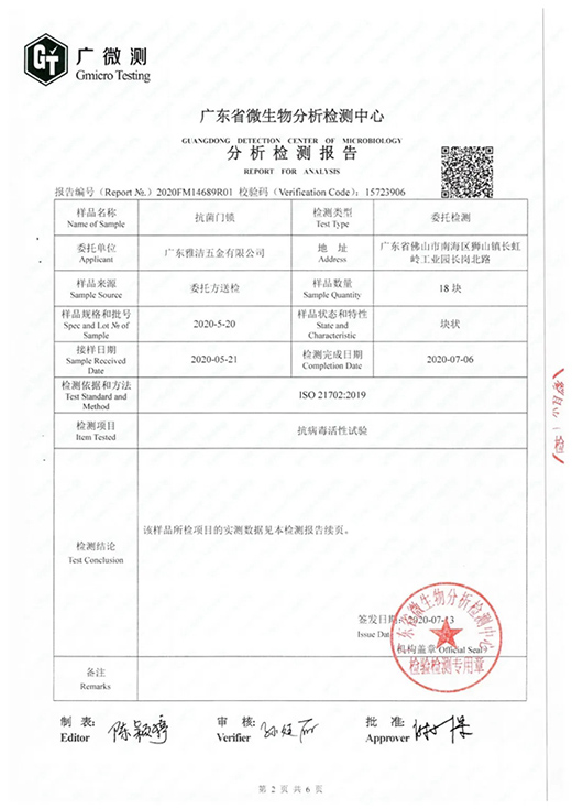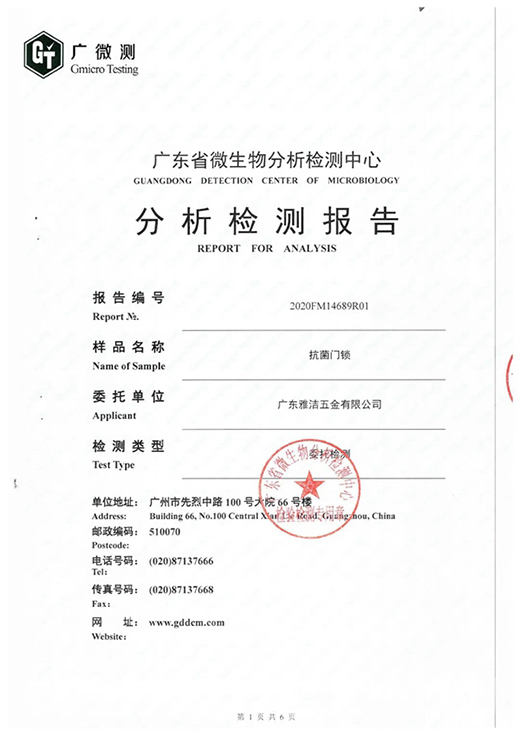經(jīng)廣東省微生物分析檢測(cè)中心檢測(cè),雅潔門鎖:在試驗(yàn)室測(cè)試條件下,對(duì)甲型流感病毒H1N1、腸道病毒71型、脊髓灰質(zhì)炎病毒-I型的抗病毒活性率高達(dá)90%。