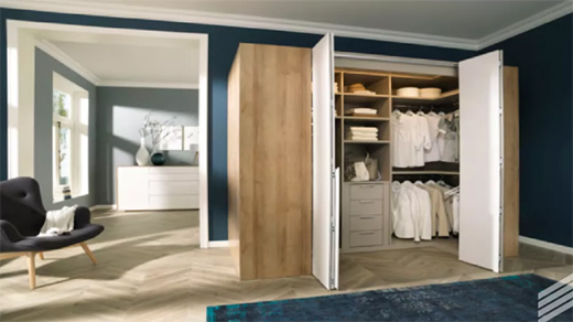 老年人行動(dòng)逐漸不便,居家生活中要十分注意防止摔跤和二次傷害,在此方面我們建議采用無(wú)下軌的折門(mén)設(shè)計(jì)。例如,無(wú)需下部導(dǎo)向折門(mén)系統(tǒng),充分利用空間的無(wú)障礙設(shè)計(jì)。