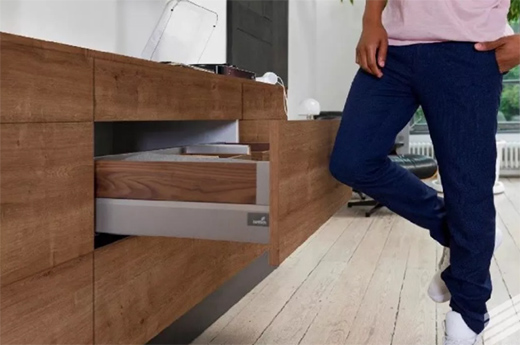 其次是功能配件是否符合人體工程學(xué)。我們的建議是:采用功能件,存取物品時(shí)盡量不用彎腰。再者是采用推彈抽屜滑軌,開(kāi)關(guān)抽屜也可以實(shí)現(xiàn)無(wú)需彎腰。