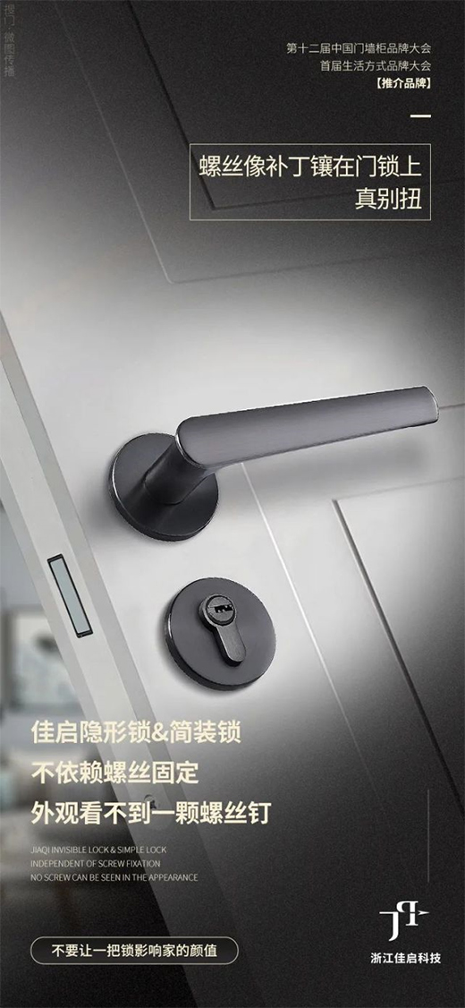 常規(guī)隱形門鎖存在執(zhí)手、面板等與普通分體鎖外觀不統(tǒng)一的問題,使得同屋門鎖外觀不一致,破壞家的整體美,佳啟隱形鎖與簡裝鎖從款式到顏色均一致,做到同屋鎖體視覺統(tǒng)一,并且裝好后看不到一顆螺絲釘,讓顏值大大提升。