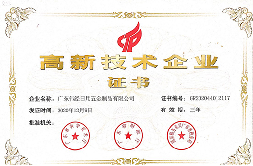 今年年初,廣東偉經(jīng)金屬、廣東偉經(jīng)家居榮獲廣東2021第三批高新技術(shù)企業(yè)認證。獲得國家在高新技術(shù)領(lǐng)域重點支持,代表著廣東偉經(jīng)集團研發(fā)成果在國內(nèi)得到認可,而這也是廣東偉經(jīng)集團長期堅持創(chuàng)新研發(fā)結(jié)出的碩果。