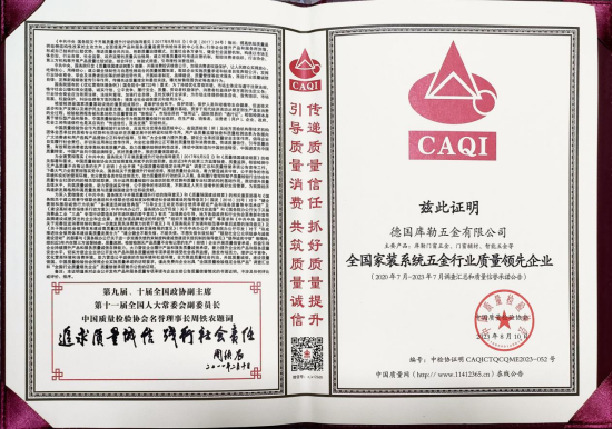 質(zhì)量決定一切,有好質(zhì)量,市場才認(rèn)可產(chǎn)品;有好質(zhì)量,企業(yè)才擁有誠信;有好質(zhì)量;企業(yè)才能夠脫穎而出!近日,我國開展“質(zhì)量月”活動(dòng)對廣大企業(yè)進(jìn)行質(zhì)量評選,其中庫勒五金榮膺“全國質(zhì)量誠信標(biāo)桿典型企業(yè)”;“全國家裝系統(tǒng)五金行業(yè)質(zhì)量領(lǐng)先企業(yè)”;“全國家裝系統(tǒng)五金行業(yè)質(zhì)量領(lǐng)先品牌”;“全國質(zhì)量檢驗(yàn)信譽(yù)保障產(chǎn)品”等多個(gè)榮譽(yù)。