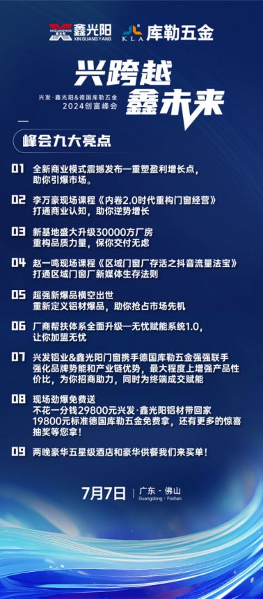 在門(mén)窗行業(yè)風(fēng)起云涌的今天,如何抓住機(jī)遇,實(shí)現(xiàn)跨越式發(fā)展?7月6-7日,庫(kù)勒五金攜手興發(fā)·鑫光陽(yáng)門(mén)窗,共同舉辦“興跨越·鑫未來(lái)”財(cái)富峰會(huì),為門(mén)窗行業(yè)注入新的活力與機(jī)遇。