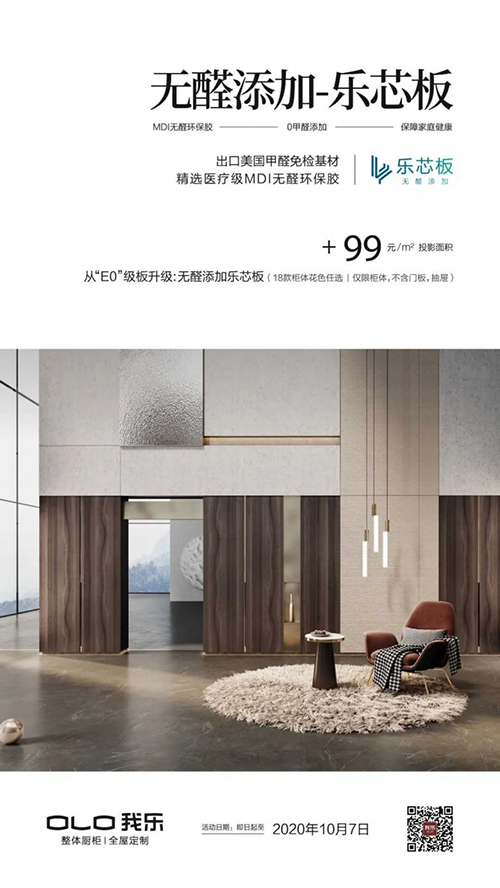 配套的市場(chǎng)動(dòng)作也隨之而起,據(jù)不完全統(tǒng)計(jì),2020年以來,僅定制家居行業(yè)里,以無醛添加為賣點(diǎn)的營(yíng)銷活動(dòng)至少已有8起,最近備受關(guān)注的則是我樂家居的“樂芯板”升級(jí)活動(dòng),每平米+99元就能做到E0板升級(jí)無醛添加樂芯板,18款柜體花色任意選。
