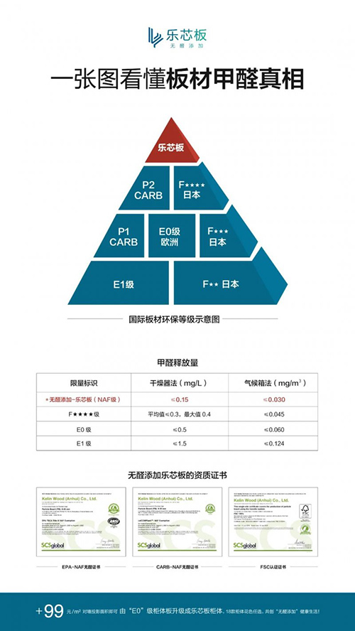 而今年“樂芯板”的面世,在原有的E0環(huán)?;A(chǔ)上又實(shí)現(xiàn)了升級(jí),從技術(shù)上來講,它精選醫(yī)療級(jí)MDI無醛環(huán)保膠,柜體甲醛釋放量≤0.03mg/m3,比原來的歐標(biāo)E0級(jí)、日本F4星標(biāo)準(zhǔn)等都要嚴(yán)格。