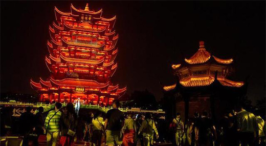 資料圖,圖為2020年“十一”黃金周,游客夜游黃鶴樓