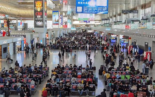8日早,南京南站中的客流熙熙攘攘。