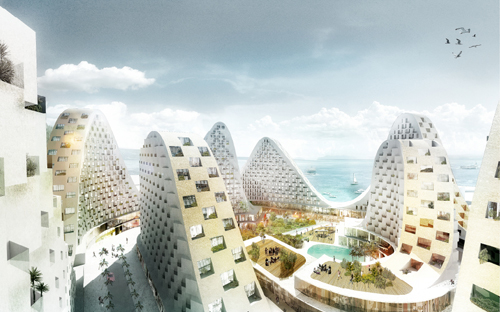 為了最大限度擴(kuò)張伊斯坦布爾馬爾馬拉海的視野,設(shè)計(jì)師設(shè)計(jì)了這個(gè)名為“橄欖海角城”綜合體項(xiàng)目。該設(shè)計(jì)是由連綿起伏的弧線建筑體組成,為場(chǎng)地內(nèi)外的住宅單元都能擁有海景視野。場(chǎng)地位于伊斯坦布爾市中心與機(jī)場(chǎng)之間的橄欖海角濱水區(qū)。該項(xiàng)目包括住宅、以及底層的商業(yè)區(qū)和公共空間。建筑上方的立面由一系列的陽(yáng)臺(tái)組成柵格的造型。此外,水道根據(jù)建筑的整體布局,將海水引入到場(chǎng)地內(nèi)部。
