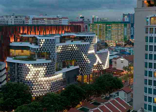Iluma是一個(gè)集娛樂(lè)和零售于一體的開(kāi)發(fā)項(xiàng)目,坐落在新加坡著名的白沙浮街區(qū)(Bugis Street),目前藝術(shù)、教育及娛樂(lè)是這一街區(qū)的主要職能。在這棟建筑中,線性體塊與曲線形雕塑造型體塊形成了鮮明對(duì)比。